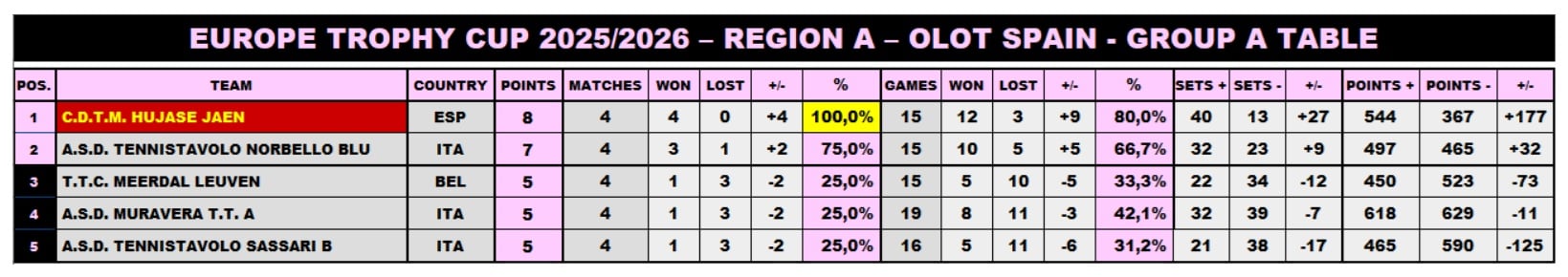 El Grupo A, disputado en Olot, reunió a clubes con amplia trayectoria en competiciones europeas como A.S.D. Tennistavolo Norbello Blu, A.S.D. Tennistavolo Sassari B, A.S.D. Muravera T.T. A y T.T.C. Meerdaal Leuven. En este contexto, HUJASE JAÉN PARAÍSO INTERIOR logró adaptarse con rapidez al formato de competición, manteniendo un nivel estable en cada una de las rondas disputadas y cerrando la clasificación con pleno de victorias.