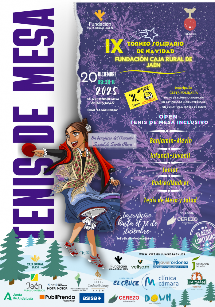 El IX Torneo Solidario Inclusivo de Navidad , organizado por el Club Deportivo de Tenis de Mesa HUJASE JAÉN , con la colaboración de la Fundación Caja Rural de Jaén , promete ser un evento deportivo y solidario para la temporada 2025/2026. Este emocionante torneo tendrá lugar el 20 de diciembre , en la Sala de Tenis de Mesa Antonio Maza del CDMJ La Salobreja de Jaén, de 8:00 a 15:00 horas .